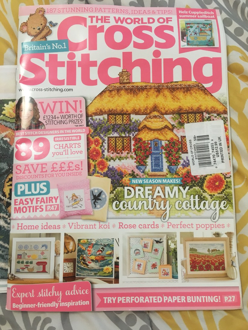 Today, I’m working on a fun cross stitch project that I’m looking forward to getting finished. It’s called Underwater Jewels by Carol Thornton in The World Of Cross Stitching. I’m not sure how to tell which issue it is though, so here’s a picture of the cover. I’m working on a few projects from this one. So many cute patterns in there!