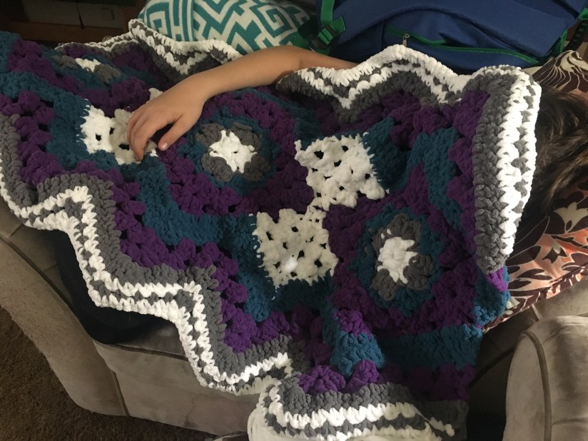 The mystery stitch along has been an interesting experience because I’ve never done a mystery one before. You can find it here. I’m hoping I can get caught up before the next and last clue is put out on Monday. It’s Bernat Blanket yarn. I’m sure it could be done with any other bulky yarn. Here’s where it’s currently at, my son decided he wanted to curl up with it because it is so soft.