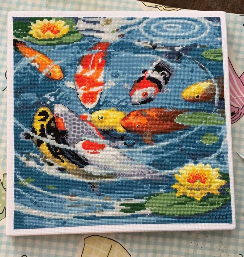 I finished the Koi Pond and got it stretched on the canvas. My friend absolutely loved it and says she’s not worthy of such a gift. I love giving handmade gifts to fellow crafters. They understand how much time and effort goes into making things. Here is what it looks like completed and ready to package. I had a really hard time waiting to give it to her.