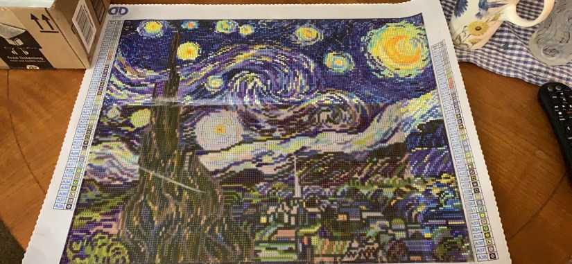I received a diamond painting from my mom for Christmas that I have been working on when I have spare time and am not completely in a stitching mood. It’s a lot of fun. I can definitely see why it’s so popular right now. One of the cats loves jumping up and “assisting” to get some pets and let me know it’s dinner time.