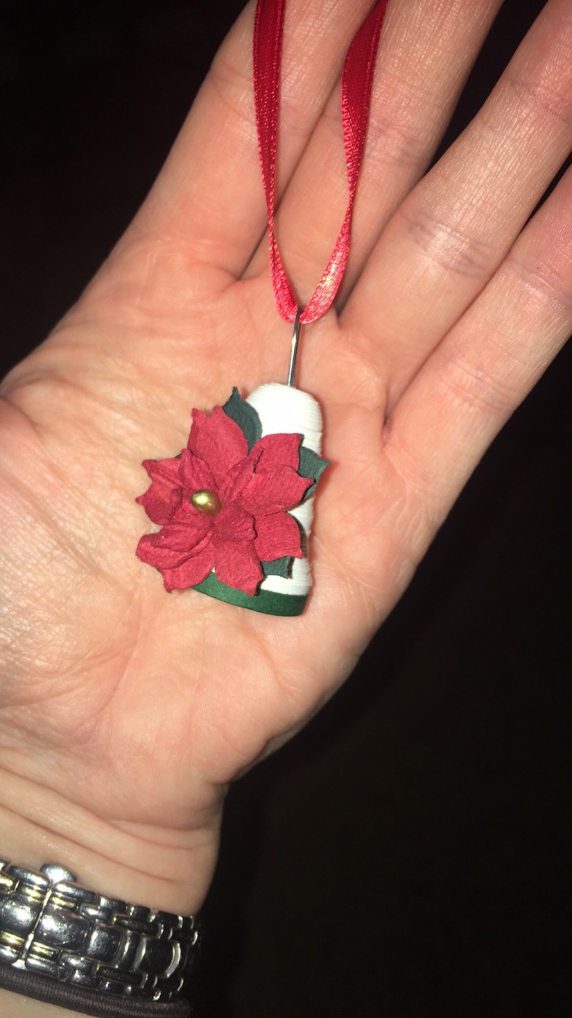 I designed and finished my quilled ornaments for the ornament exchange and potluck. It was so much fun. I was even able to get them all hung on my little tinsel tree to show them off. I made a simple cone, put a trim around the bottom, and stuck a pre-made paper poinsettia to them. They seemed so simple, so I added a jingle bell to the inside with the hangar piece, then attached a length of ribbon so they can hang from a branch. So simple, but still cute as heck.